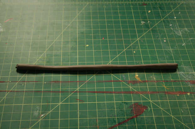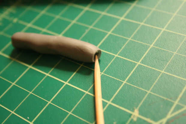 En primer lugar, extienda la arcilla en una serpiente delgada y pequeña. Entonces, corte aproximadamente 1 a 2 pulgadas de largo con su cuchillo x-acto. Ahora, vas a hacer un agujero en las cuentas empujando un pincho por el centro del grano. Puede mover alrededor para hacer el agujero lo suficientemente grande como para pasar la cadena.