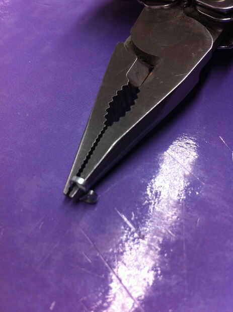 Coloque las pinzas en el ⅔ de la parte plana de la grapa. Luego doblar un lado de la grapa, que reunirá los dos bucles para que toquen entre sí. El pulgar puede convertirse en dolor, así que usted puede utilizar la tabla para reunir los dos ganchos.