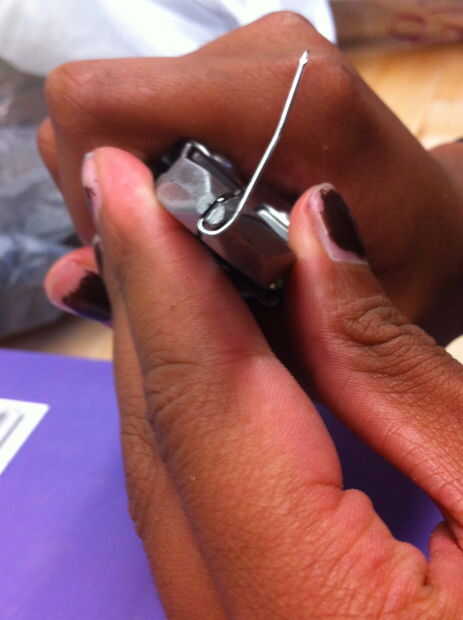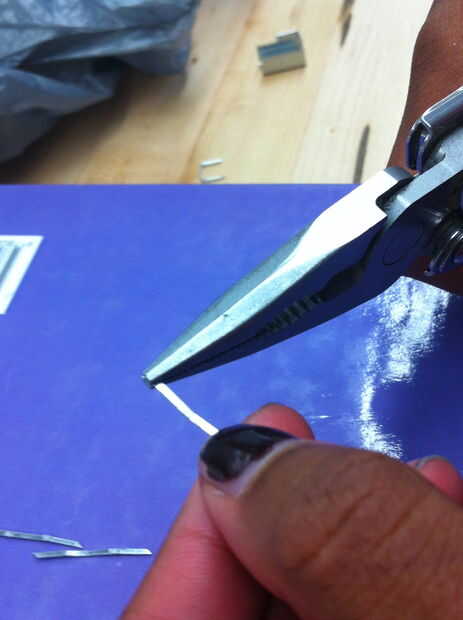 Alicates de lugar en el extremo de la grapa. Gire hacia el interior, envolviendo la grapa alrededor de los alicates. Los alicates deben crear un bucle que completamente no toca la parte de la grapa que es plana. Deje espacio para unir corazones.