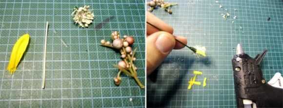 Había rematado un trozo de alambre rígido con un pequeño brote blanco fuera un ramo de flores de plástico, luego en rodajas un brillante pedal de plástico amarillo en tiras y había pegado en la parte inferior en el capullo blanco en un arreglo circular. Usé otro recorte de vid-como plástico y unido a la madre para dar a la flor de cierta profundidad. También logré encontrar las láminas de plástica de la hierba que será utilizado cuando la flor está en el dedal.