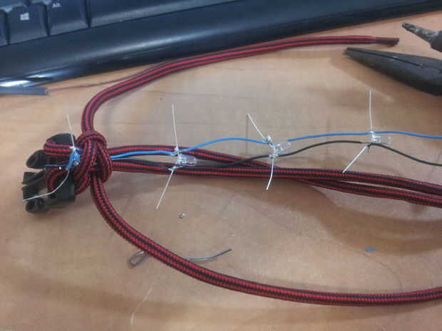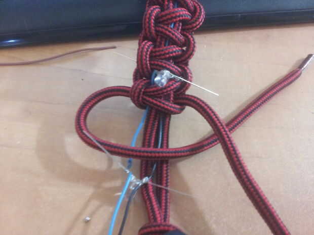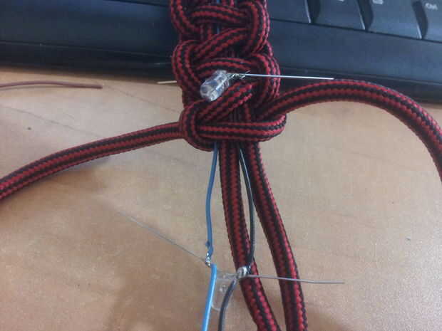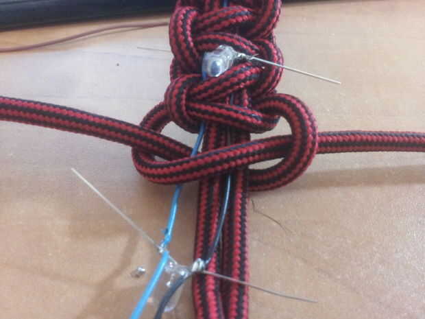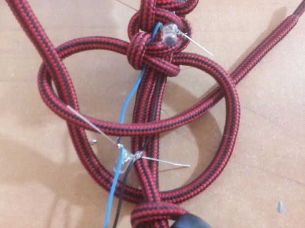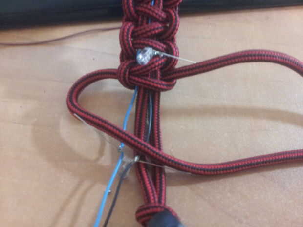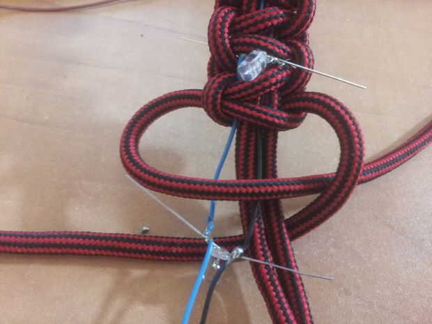 Inserte el primer LED a tu primer nudo y guardar tejido como en las fotos.