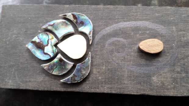 Después de haber cortado las formas, ahora tenía plantillas para cortar la forma de la materia prima. Usé mi dremmel para esta usar un disco de corte fino. Con el hueso y la concha de paua, una máscara es esencial. El polvo no es bueno para usted. Realmente apestan cuando se cortan, y he leído que el polvo de paua es realmente malo para los pulmones.