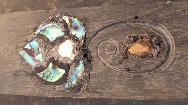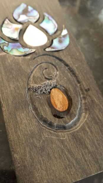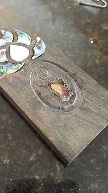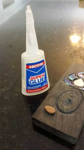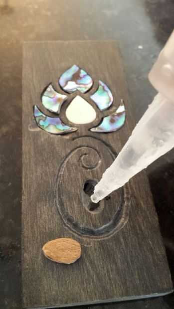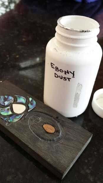 Empezar poniendo pegamento dentro de la forma. Luego coloque el corte hacia fuera de forma en el agujero. Una vez que se coloca, verter polvo de ébano sobre la forma y llene todas las grietas. Entonces poner pegamento sobre la parte superior de eso. Trate de bajar en boquetes así. Esto actúa como una masilla de madera super rápido endurecimiento.