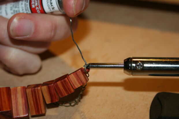 Cuando soldadura de anillas. Yo simplemente cuelgue el anillo del salto a la punta del soldador, con el lado de la costura, dejarlo calentar. Luego toco la costura con la soldadura. Sólo asegúrese de no quemar accidentalmente su madera o hilo de rosca. O mejor aún, atar el hilo sobre después de haber soldado el anillo del salto.