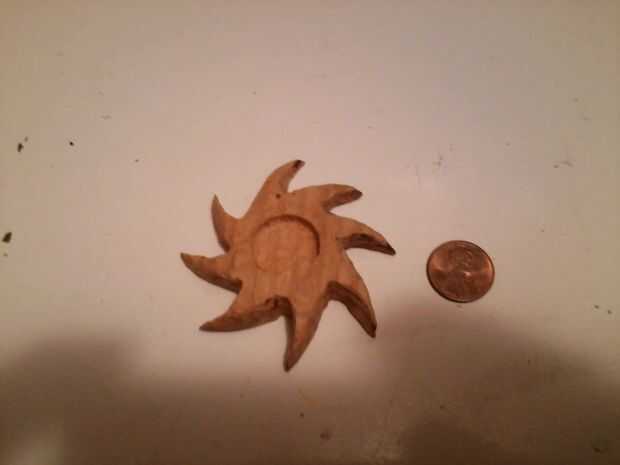 Cuando el pegamento seca y plantilla fue firmemente en su lugar salió mi dremel y utiliza un ultrasonido de 2 bits de enrutamiento diferentes tamaño como una rueda de corte de fibra de vidrio para cuidadosamente cortada a lo largo de las líneas. Luego seguí enrutamiento más y más madera a la profundidad de mi losa de madera (probablemente 1/2"-3/4 espesor) que tuvo un par de horas. Una vez que tuve la forma corta de la losa que luego me centré en redondear los bordes con la rueda corte router bits y fibra de vidrio. Usé un centavo para marcar un círculo en el centro de corte que originalmente había previsto a introducir un centavo con mi fecha de nacimiento pero decidió hacer un diseño que en su lugar. Usé la broca de fresadora para cortar el centro del círculo 1/8" de profundidad. También corté un poco secciones triangulares de la espiral 1/8" de profundidad en cada uno de los brazos 8 espirales. Una vez que se terminó este corte solía lija de 150 arena hacia abajo un poco más suave. Luego usé un quemador de madera para oscurecer áreas de la madera dándole un aspecto envejecido, así como alisar un poco más.
