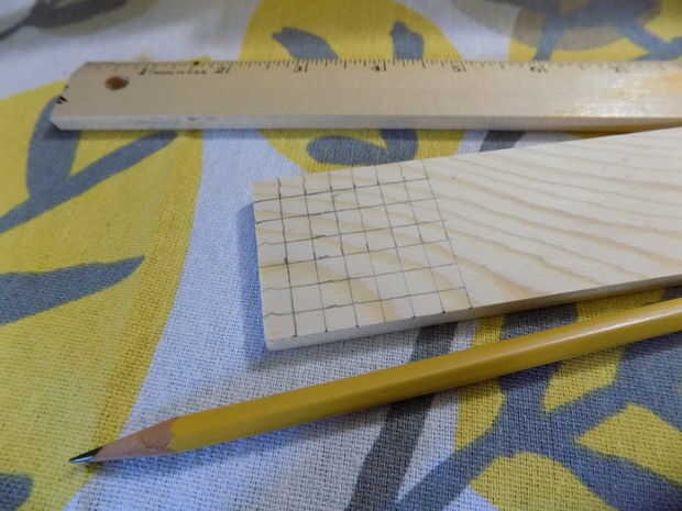 Los trozos de madera que encontré en la tienda de artesanías fueron 1,75" de ancho, así que decidí hacer mi pieza 1,75" cuadrado y haga una marca cada 1/4".