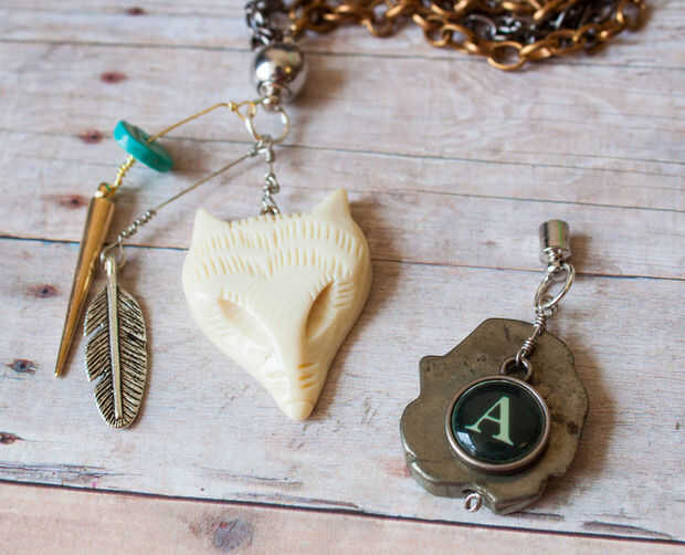 Dos a tres danglies de cualquier cosa son generalmente una buena cantidad para comenzar. Si te gusta más, por todos los medios, agregar tantos danglies como mejor parezca. Elegimos estas cabezas aseado imitación Marfil tallado fox, spike de metal oro, encanto de rueda y pluma de magnesita para nuestra primera focal y una losa de Pirita con un encanto tipo antiguos imitación de la segunda focal. Todo se une a un anillo de salto utilizando el método de fianza lo que hemos aprendido anteriormente.