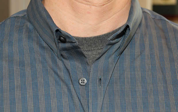 Ponga que el collar metálico recién cortado permanece en la camisa.  Coloque los imanes de disco pequeño en el interior de la camisa por las puntas del collar.  Los imanes fácilmente permanecerán adheridos a la camisa.  No he tenido ningún venido de actividad normal todavía.  Estás acabado.  No más las alas de avión.  Recuerde quitar los imanes y las estancias antes de lavar la camisa.  Si feromagnetic metal está en contacto prolongado con agua, un lío oxidado probablemente permanecerían en su camisa.