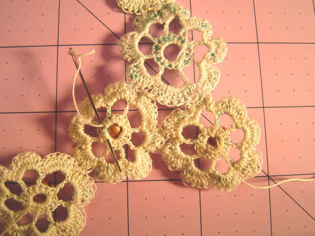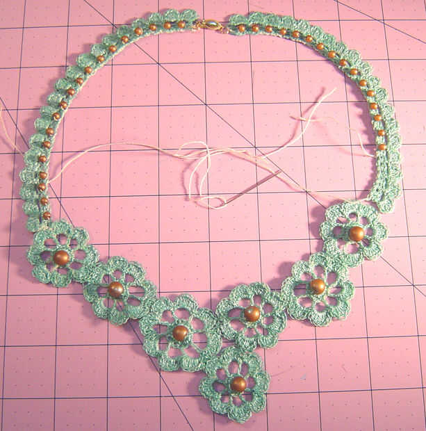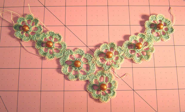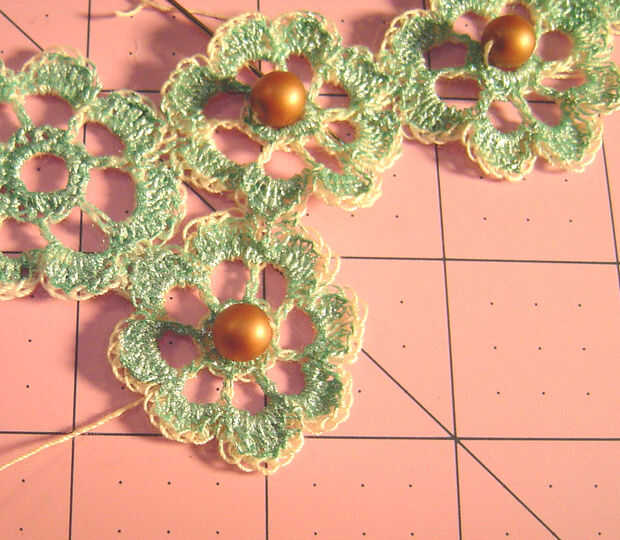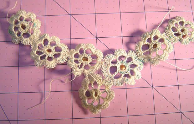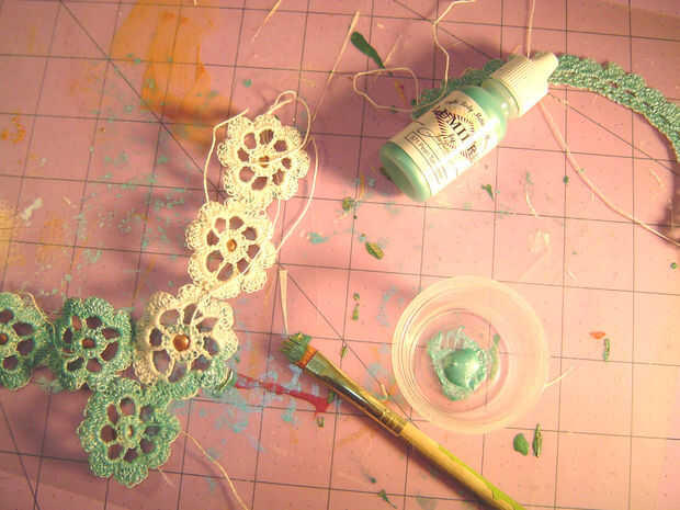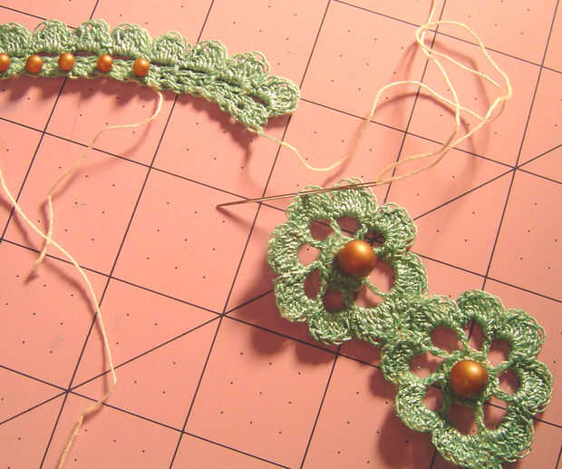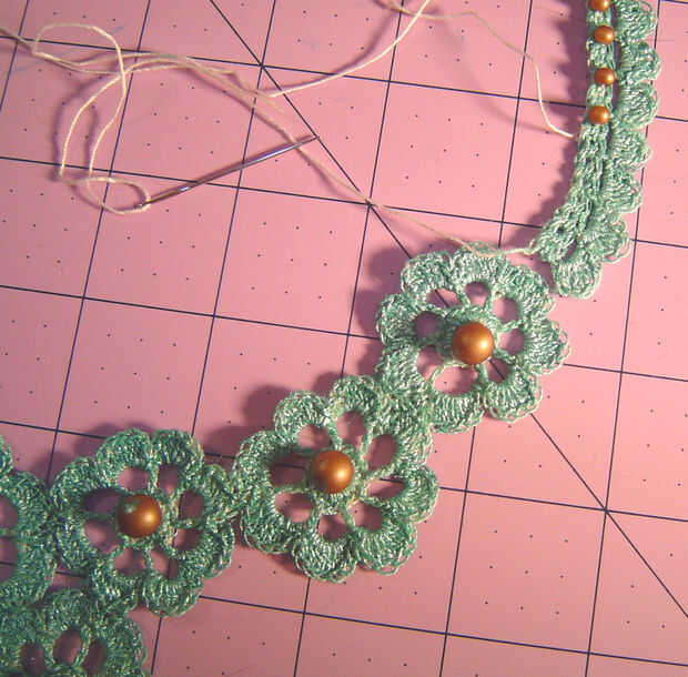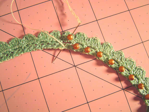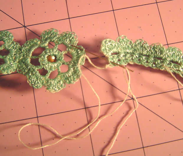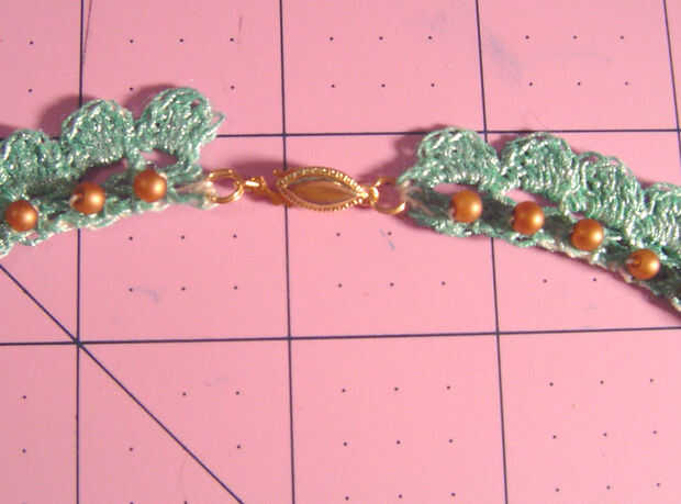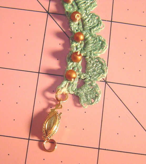 Use los hilos de inicio y finales para colocar el cierre en un extremo y el medallón al otro extremo, luego utilice el hilo para añadir cuentas a las bandas. Anude los hilos donde se encuentran. Pintar las bandas otra vez, usando la pintura para sellar los extremos del hilo.