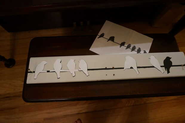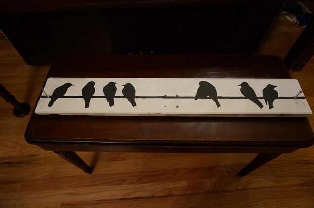 Aquí, el revestimiento pegado ha curado. Decidí no quitar la lengüeta y ranura y no añadir ningún ajuste adicional. Le da un toque más rústico/primitivo. Para terminarlo, yo simplemente cubierto con una capa de izquierda sobre la pintura de látex interior y estarcidos sobre algunos pájaros posados. Por último, pinté los pájaros negros - estilo de silueta. Si usa madera más elegante, tal vez podría mancharlo, y no tienes que pintar una decoración como la mía. Embellecen sin embargo que usted desea!
