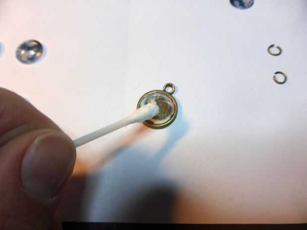 El pegamento decoupage se seca rápidamente cuando se trata con pequeñas cantidades así mientras esperas que seque, así ya podría empezar preparando los colgantes con capas delgadas de piedra pegamento. Utilice las tapas de oreja para esparcir el pegamento uniformemente, luego poner los pedazos de cristal con imágenes del planeta en posición. Presione ligeramente y esperar a que el pegamento piedra se seque. El proceso de secado debe tomar unos 30 minutos.