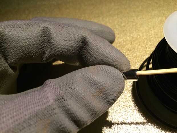 Utilice el palillo de dientes para aplicar algunos en el "extremo de la cuerda". Es el final de la hebilla que se conecta a la cuerda de cuero.