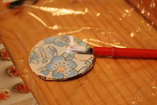 De cualquier manera, la parte de atrás tiene que ser podged, del mismo modo la parte delantera. Si quieres que sea un collar reversible, puede cortar círculos de papel que coincida con el tamaño de los discos y colóquelos sobre el podge. Entonces necesita una capa más para el sello en este papel.