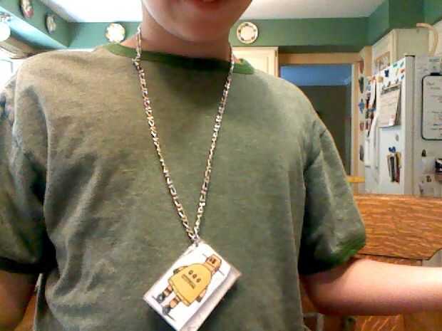 Poner el robot en un lado y su perfil en el otro lado de su base de recortables. Use la clara cinta y cinta de embalaje la en así se pegan bien. Después de eso debe tener wat parece una carta muy gruesa. Ahora tome el taladro y el taladro un pequeño agujero que la esquina y corte un pedazo de alambre y ponerlo a través. Haga un bucle con el cable y poner tu cadena o collar a través de él. Ahora tienes un collar mostrando tu sitio web favorito y y su cordinación de perfil. Por favor, RCS (calificar, comentar, suscribirse) y publicar fotos tuyas en los comentarios. Gracias