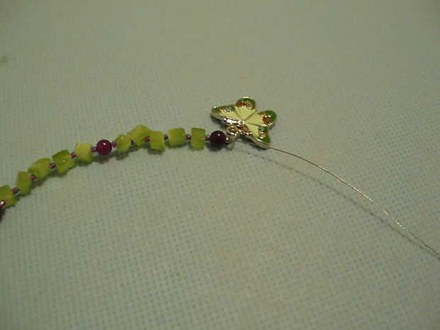 3. la cadena en el resto de los granos, añadir un encanto a la mitad si quieres. Te voy a mostrar una forma diferente de poner en un encanto, aunque.