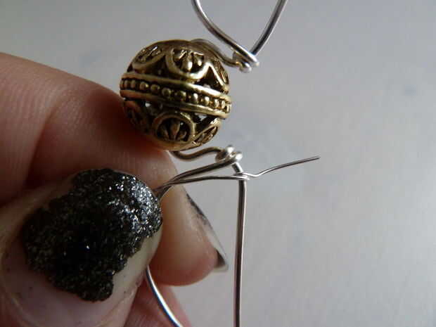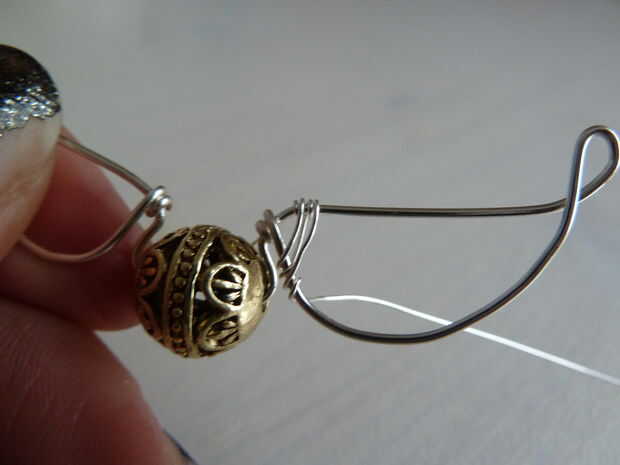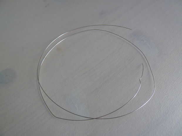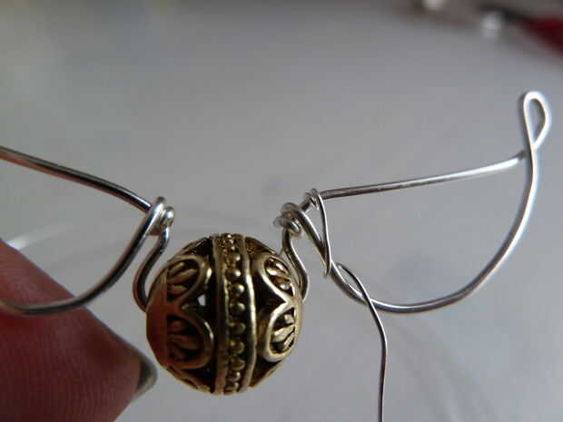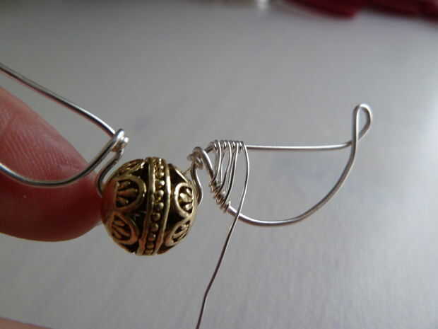 Corte un pedazo largo de calibre 26 / 0,40 mm de alambre. Sólo se cortan dos bobinas. Envuélvalo alrededor de la parte superior de una de las alas, junto a donde recién ha terminado el último paso del ala base. Asegúrese de que el cable es continuo sobre la base. Dejarlo ir hacia abajo y enróllelo alrededor de la parte inferior de la base como se muestra. Su cable está ahora bajo el ala. Hacer que vaya a la parte superior del ala, manteniendo bajo el ala. Enrolle el cable alrededor de la parte superior como se muestra y se deja descender otra vez sobre la base.