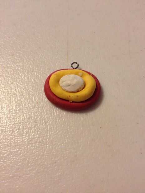 En primer lugar, obtener su rojo de la arcilla y el molde en una especie de glóbulo rojo tipo de forma. Sobre todo en una especie de óvalo como en cuadro 1. Después de eso, parte de la arcilla amarilla y un anillo y colóquelo encima de la red como en la figura 2. Luego, con la arcilla blanca, hacer una forma de elipsoide (huevo) y colóquelo en el centro como la foto 3. También tomar uno de los ganchos de la cadena y colocarlo en la parte superior. También como en la imagen tres