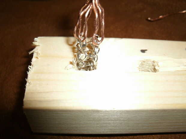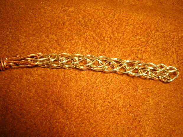 Como una guía aproximada una armadura tirada a través de agujeros de hasta 8 mm diámetro tiene 7 filas en 50 mm cuando se utiliza alambre grueso 0.9m m, por lo tanto si desea una pulsera de 200 mm necesita alrededor de 28 filas de tejido antes de extraer el tejido.