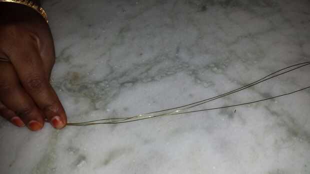 Permite empezar a preparar el collar con el hilo de engranaje inicialmente. Corte el cable de cambios en tres largas cadenas de igual longitud. Longitud depende del tamaño de su elección.