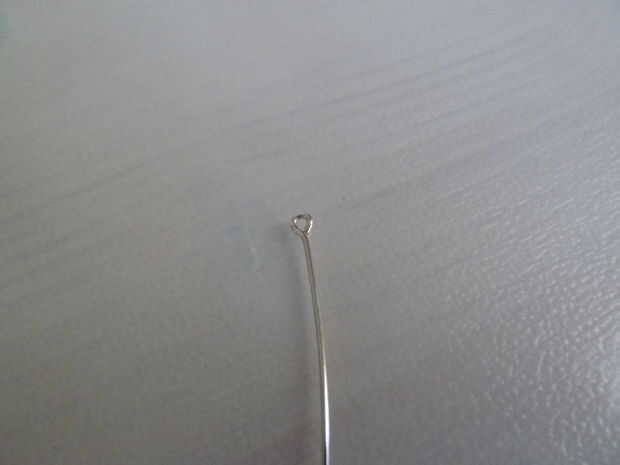 A continuación, agregue uno de sus granos. Doble el alambre hacia abajo y, usando alicates de punta plana, doblar al lado como se muestra. Continúe envolviendo el alambre alrededor del talón con los dedos.