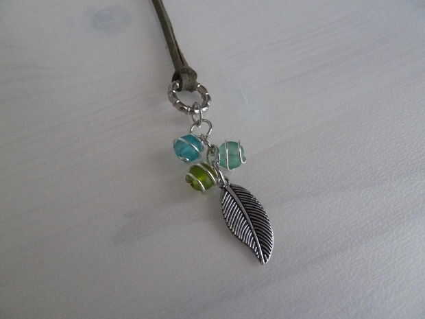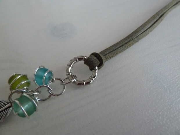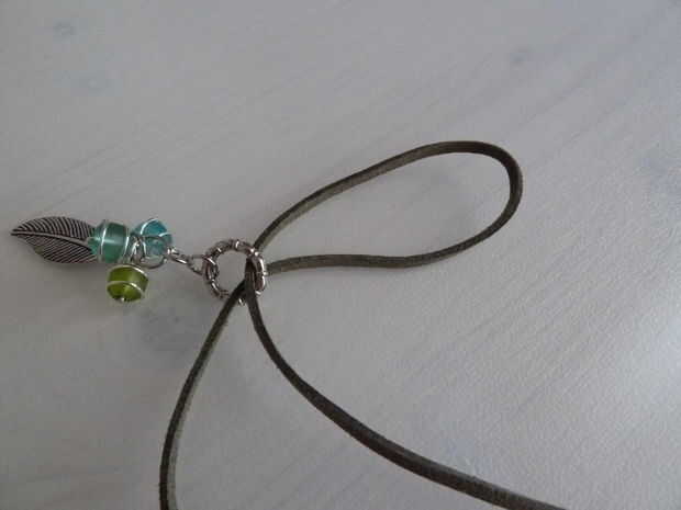 Cortar la longitud del cordón que necesitas. Doble el cordón por la mitad. Poner el lado doblado a través del lazo de conexión y poner los extremos a través del lazo. Les Tire firmemente para poner fin a este nudo. Para terminar el collar, anudar los extremos juntos.