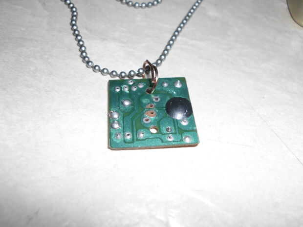 hice mi collar con una pieza perfectamente redonda de circuitos que he encontrado en un estacionamiento. Tenía un agujero ya perforado a través de él, pero usted puede perforar un agujero demasiado.Te hace falta:Esmalte de uñas transparentePlaca de c