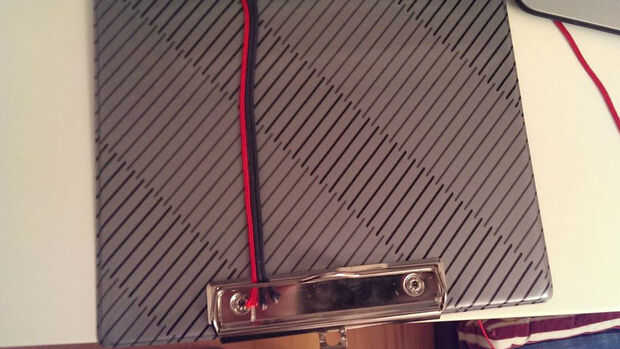 Tomar los tres hilos y ponerlos en el orden que desee: en mi caso, rojo azul azul. Utilicé un portapapeles para mantenerlos en su lugar, pero puede también Sujete con cinta adhesiva, una horquilla o simplemente atarlos juntos.