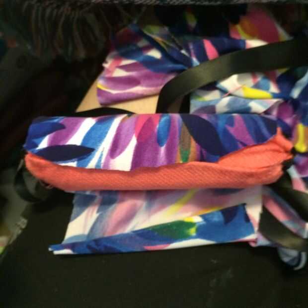 -mirar la barra de tela y las piezas de PVC pintadas. Si te gusta la combinación de colores, haya terminado con este paso. Si desea cambiar el color de la tela, coser a la tela nueva encima de la barra de fieltro cubierto de tela (como lo hice)