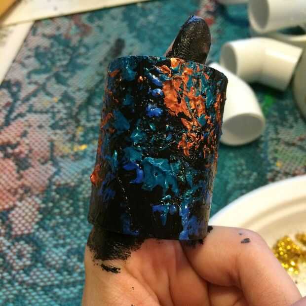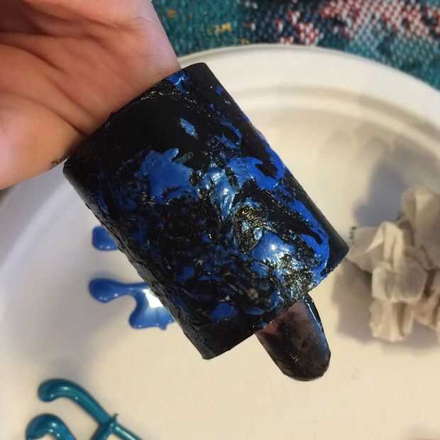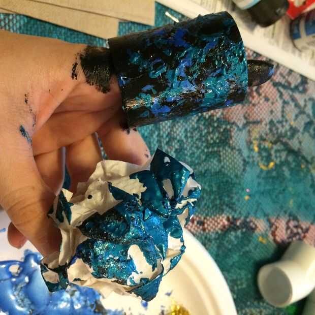 5) repetir 2-4 partes con una toalla de papel nueva (para mantener la pintura de conseguir embrolló en PVC) con el siguiente color de la pintura. Opté por usar mi siguiente color oscuro. Superponerse algunas pero tenga cuidado de no cubrir su pintura negra!