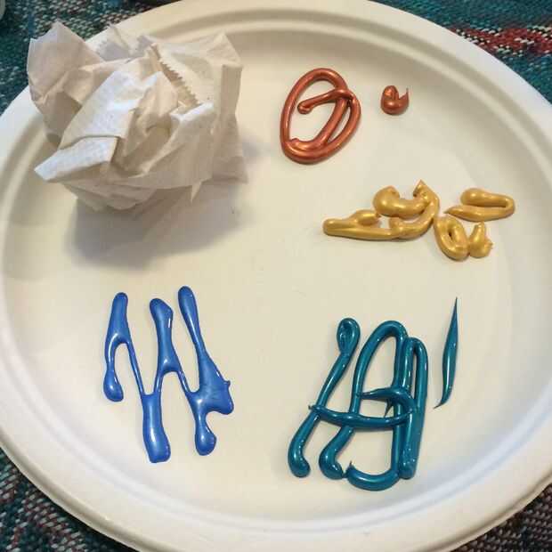 1) exprimir pequeñas cantidades de cada color de pintura que está usando hacia fuera sobre la superficie de la paleta. tienes que no apriete la pintura en los blobs. hará más difícil para no pintar gotas sobre el PVC. lloviznas de pintura en tu paleta es mejor!