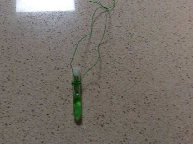 Primero llenen el tubo con agua completos 3 cuartos y añadir la comida con la pajita no desea agregar demasiado porque entonces el color se oscurecerá muy, muy! Luego extraer el inodoro o el papel en trozos muy pequeños y añadir algunos pedazos de papel higiénico, tejido en el tubo (opcional) a continuación, puede añadir un brillo demasiado (opcional). Luego, ate un trozo de cuerda del tamaño de una regla de 30cm alrededor del tubo (Ten cuidado: si empujas la cuerda hacia abajo o hacia arriba puede mover pero cuando es colgada en el cuello no pasará! (Se puede mover un poco) luego atar ambos extremos de la cadena en un nudo apretado (preferiblemente un nudo doble). AHORA LISTO HACER EL COLLAR DE POCIÓN!