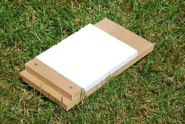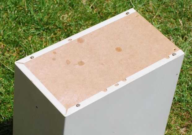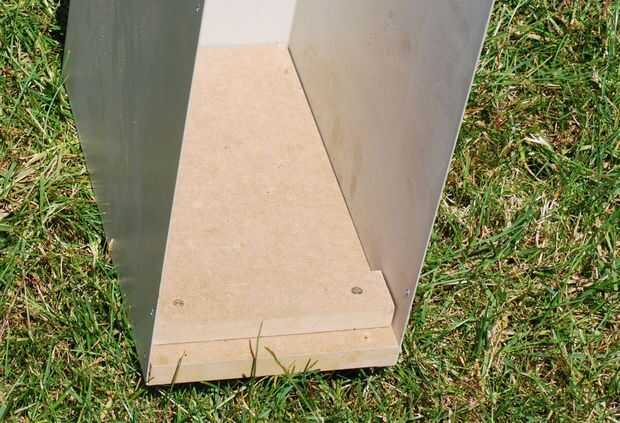 La parte posterior de la caja de la PC se convertirá en la parte inferior de la colmena, por lo que los agujeros en el caso se pueden usar para colocar el panel inferior, una pieza de MDF cortada al tamaño correcto. He añadido un 'espacio de aterrizaje', una pieza MDF de 3 cm de ancho que también protegerá el aislamiento inferior para ser expuesto.