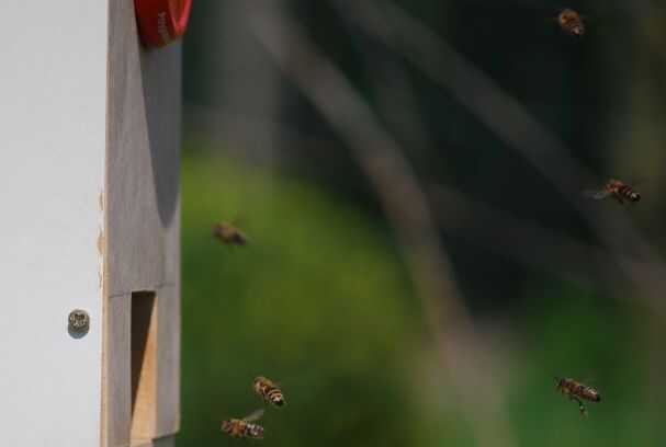 Parece como si las abejas están felices con su nueva casa. Vi a la Reina que va y otra vez. Muy pronto ella se irá para un vuelo de apareamiento y empezará a poner huevos. 21 días más adelante abejas obreras dejan las células mientras salen zánganos después de 24 días.