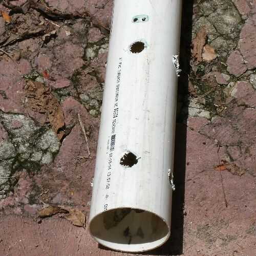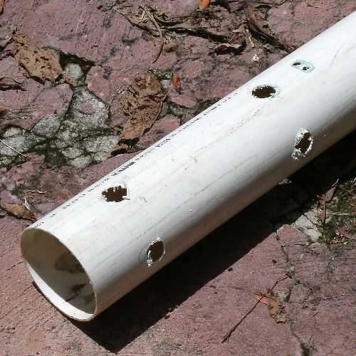 En la parte superior de la tubería, corte los orificios. Uno, que va un poco por debajo de la cubeta es el orificio de entrada de la abeja. Los agujeros más grandes son para que las abejas para acceder a la zona de balde desde el interior de la tubería.