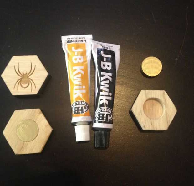Utilizando un pegamento o epoxy que trabaja para madera y metal, los discos de latón en lugar del pegamento. puede que desee tener un trapo y un martillo en mano a las piezas para ir todo el camino.