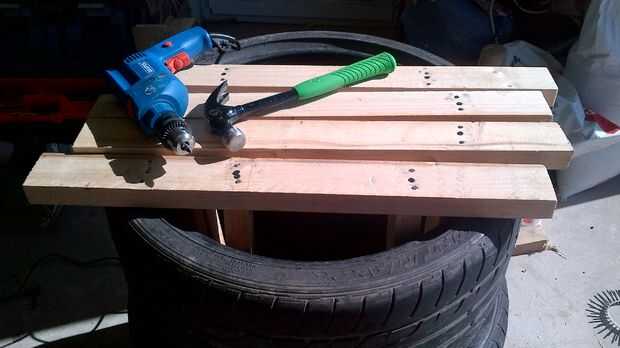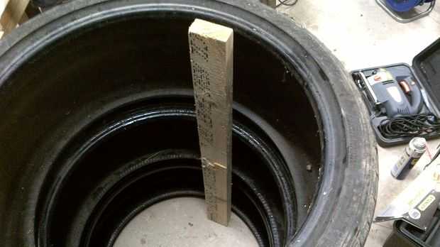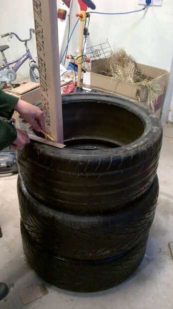 En primer lugar todo el neumático encima de la otra de la pila, luego medir la distancia desde la parte superior hasta la parte inferior. Cortar 8 de estos, pero todo depende de la anchura de la madera y el neumático. A continuación cortar las piezas más para la parte superior e inferior. Usted también necesita tomar en espacio de la abeja cuenta he utilizado un trozo de madera que mide 1 cm.