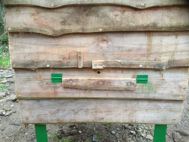 Une las bisagras a la puerta y una sección de madera debajo para que lo apoyen cuando está abierto. Perfore un agujero de 12mm como se muestra y agregar el retén giratorio y mantenga el dedo.