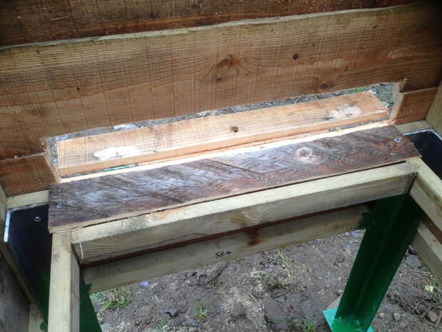 Atornillar el tablero del aterrizaje dentro de la entrada, pero sin interferir con la colmena nacional, que se sentará en el marco de madera que puede verse claramente en la foto. Pintar las patas con poco metal brillo exterior de monocapa pintura por ejemplo. Johnsons. Afile los tornillos que sobresalen con la amoladora angular.