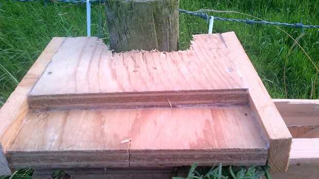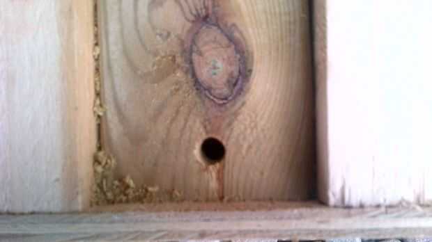 Para el techo tome un pedazo de madera sobre un centímetro o dos más ancha que la colmena y otra pieza del mismo tamaño y fíjelo a mitad de camino en la primera pieza. Ahora toma dos piezas de madera que son la misma longitud que su colmena y péguelas a los lados de la cubierta. Para la entrada de perforar un gran agujero en la parte inferior de la colmena. También para la maceta perfore dos agujeros en los laterales para el drenaje.