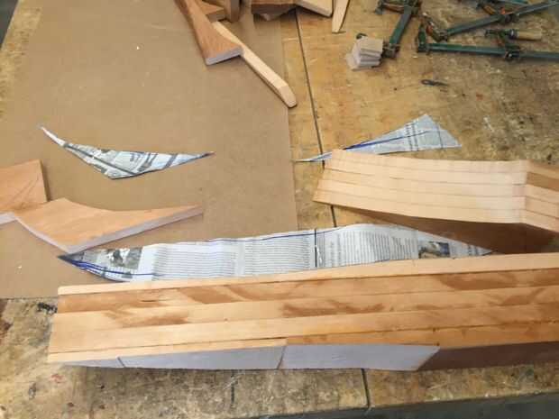 Con las otras dos partes de mi plantilla, I comenzó el corte de piezas de madera en la Sierra de banda se forma, entonces había laminado cinco capas juntos para el final y había pegado dos piezas de desecho para la punta.