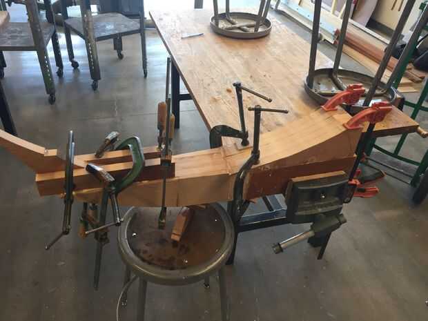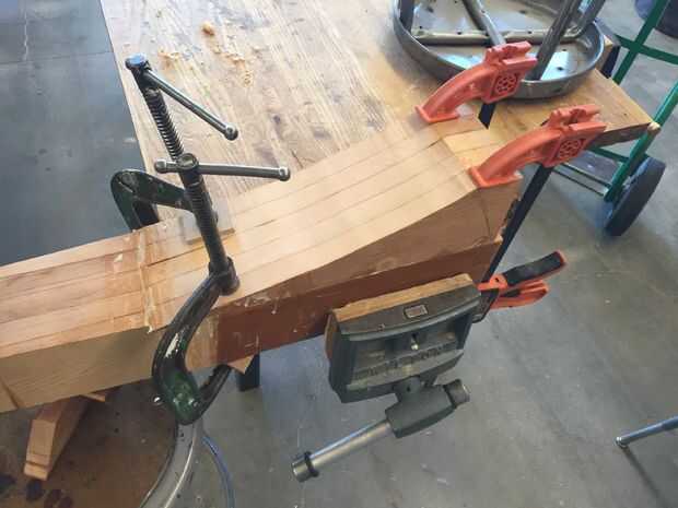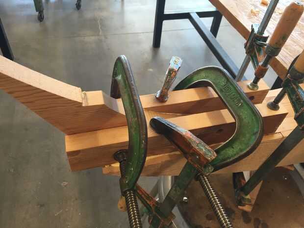 Para el pegamento hasta agrega dos piezas rectangulares de desecho para proporcionar espesor adicional y una superficie de sujeción más segura. Puse la pieza principal en una prensa de tornillo que me permitió colocar las abrazaderas más convenientemente.