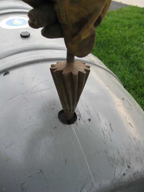 Tenemos que hacer el agujero lo suficientemente grande para aceptar el montaje del tabique hermético. Tuve una broca lo suficientemente grande, pero no el taladro con una tirada bastante grande. Así que cogí exprimidor antiguo de tío Rudy y guantes de cuero grueso y lentamente hizo el agujero más grande.