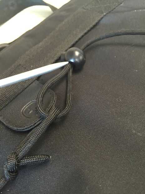 Tome una longitud del extremo suelto de paracord e inserte a través del lazo del nudo as de guía. Tire a través e inserte el extremo suelto hacia atrás a través de la cerradura de la cuerda. Se encontró que el uso de una aguja de paracord ayuda a pase el extremo suelto de la cerradura de la cuerda. (la aguja de paracord es una variación más aguda de la fib de paracord que se describe en este Instructable). Repita para el segundo par de cables.