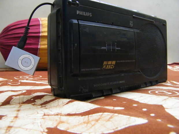 En las fotos he conectado un iPod Shuffle y también un viejo teléfono Nokia. El teléfono tiene una radio y un conector de 2,5 mm usé un 2,5 mm macho - conector hembra de 3,5 mm para el teléfono.