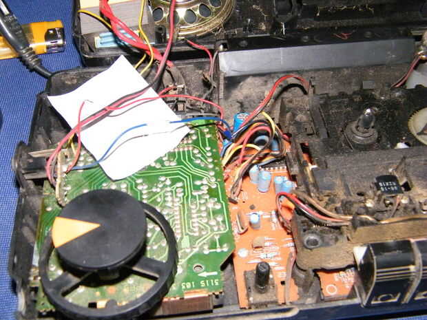 Si nos fijamos en la foto ves el reatado cables #5 por debajo de la cual he colocado un papel blanco (para actuar como un fondo para la foto). También puede ver los dos juegos de cables procedentes de debajo de la #3 y la conexión con la Junta de cassette, reproductor (en la parte superior derecha)
