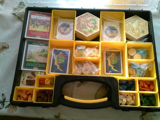 En primer lugar off amo los colonos de Catan. Sin embargo con Add-ons, 5-6 jugadores juegos y escenarios de la caja o se atasca completo, (hasta el punto de dañar las piezas) o un kluge de bolsas ziplock.