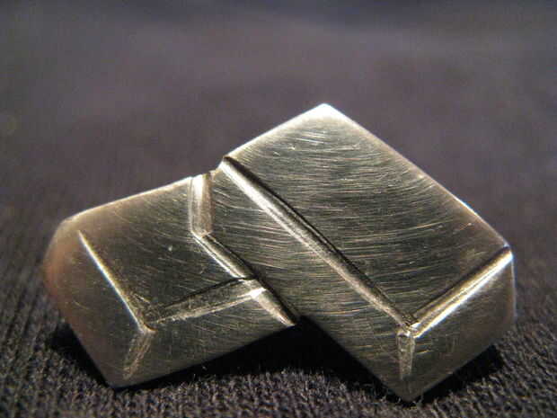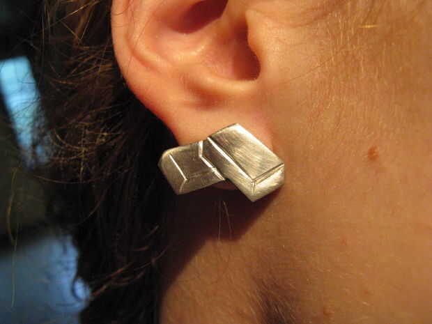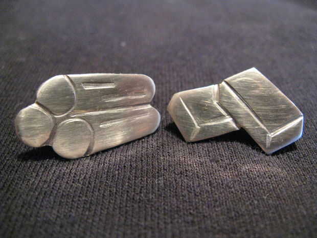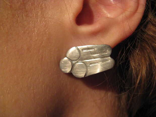 Las monedas fueron martillados planas, luego presentado en las líneas correctas. Luego utiliza clips para crear las líneas con sangría y lijado/pulido las piezas liso. Un par de pendientes antiguos fue sacrificado por sus puestos de trabajo, que se ajustaron a la parte posterior de cada pieza.