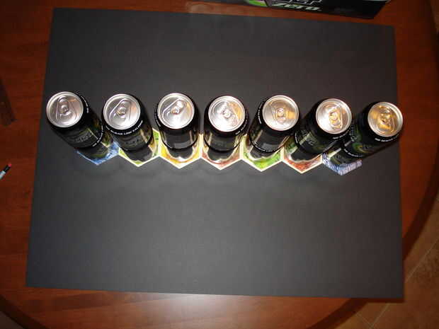 7 arreglar los azulejos en el centro de la primera pieza del tablero de la espuma.  Encargué a estos sabios de longitud.  He utilizado una regla para obtener las fichas igual distancia desde los bordes de la Junta de espuma.  En mi ejemplo fue 77 ~ y ~ 235 mm de los bordes.  Luego apliqué las latas de soda para mantener las baldosas en su lugar.  Entonces reuní los azulejos restantes.