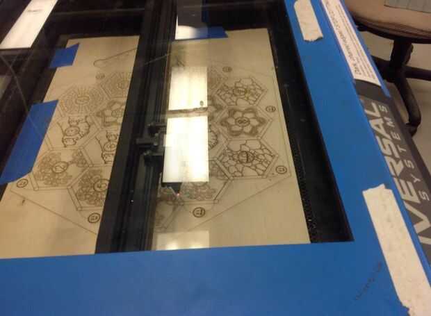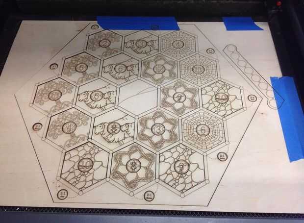 A continuación, se deben recortar sus azulejos hexagonales (junto con las fichas numeradas). En primer lugar, la máquina debe grabar antes de cortar para que todo esté en el lugar adecuado (como piezas pueden mover ligeramente durante el corte).