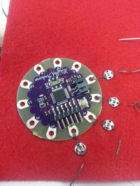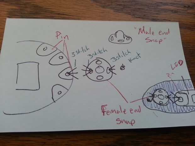 Paso 4: Usando hilo conductor y la aguja de coser cosen componentes y broches en fieltro.